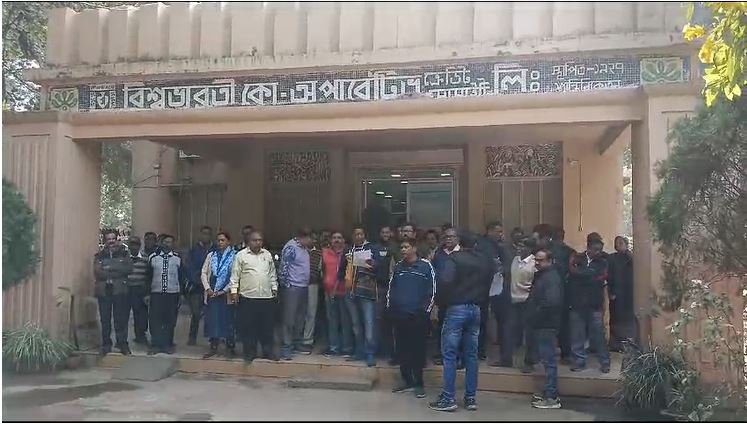 বিশ্বভারতী কো-অপারেটিভ সোসাইটি ব্যাঙ্কে শেয়ারহোল্ডারদের বিক্ষোভ ।। অবিলম্বে নির্বাচন, বাৎসরিক স্মারক প্রদান, লোনের উপর সাবভেনশন সহ একাধিক দাবিতে বিক্ষোভ, ডেপুটেশনকে ঘিরে কেন্দ্র করে উত্তাল বিশ্বভারতীর কো-অপারেটিভ সোসাইটি। দাবি না মিটলে বৃহত্তর আন্দোলনের হুমকি বিশ্বভারতীর শেয়ারহোল্ডার কর্মীদের। কার অঙ্গলী হেলোনে দীর্ঘ ৪-৫ বছর ধরে নির্বাচন হচ্ছে না রবি ঠাকুরের শান্তিনিকেতনে বিশ্বভারতী কো-অপারেটিভ সোসাইটি ব্যাংকের ? বাৎসরিক স্মারক প্রদান সহ একাধিক দাবিতে মঙ্গলবার বিশ্বভারতীর শেয়ারহোল্ডার কর্মীরা বিক্ষোভে সামিল হলেন। বিশ্বভারতীর কো-অপারেটিভ ব্যাংকের সামনে দীর্ঘ সময় ধরে বিক্ষোভ দেখান তারা। শেয়ারহোল্ডারদের বিক্ষোভকে ঘিরে রীতিমতো শান্তিনিকেতনে বিশ্বভারতীর সমবায় ব্যাংকে উত্তেজনার পরিবেশ তৈরি হয়। আন্দোলনকারী বিশ্বভারতীর কো-অফারেটিভ শেয়ার হোল্ডারদের দাবি, অবিলম্বে সমবায় ব্যাংকে নির্বাচন করতে হবে। দীর্ঘদিন ধরে অসাধুচক্রের অঙ্গুলী হেলনে নির্বাচন আটকে রয়েছে। যে কারণগুলি সামনে আনা হচ্ছে তা অত্যন্ত যুক্তিহীন। এছাড়াও ব্যাংকের সদস্য হিসেবে এ সমস্ত সুযোগ-সুবিধা পাওয়া যায় তা বঞ্চিত। আমাদের দাবি না মিটলে আগামী দিনে বৃহত্তর আন্দোলনের হুঁশিয়ারি।